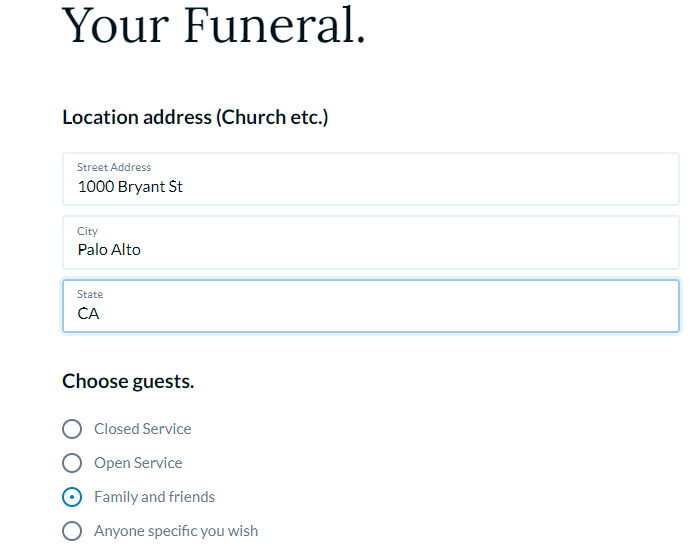 This is your Funeral Directive so we’ll start with you. In this section, you’ll provide basic information such as your name, email address, birthday, phone number, and address.